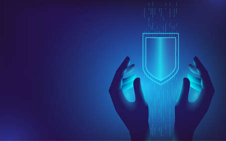Hands hold a neon virtual shield on one of the data streams. Vector illustration on the topic of cybersecurity. Template for a horizontal banner or poster.