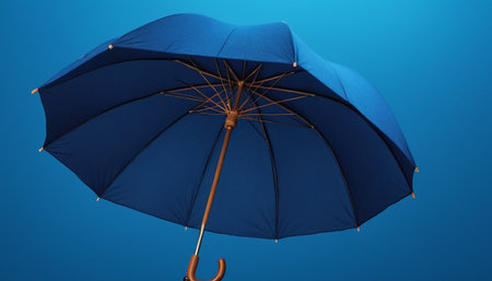 A bright yellow umbrella standing against a vibrant blue background, creating a striking minimalist composition. Ideal for concepts of protection, rain, and design.