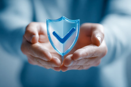 A confident individual grasps a clear blue barrier featuring a prominent checkmark, symbolizing dependable safety, assurance, and integrity amid a modern digital env