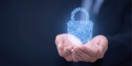 Person in a dark suit is holding a glowing, digital padlock in their hands. This could represent information security, data protection or cyber safety.