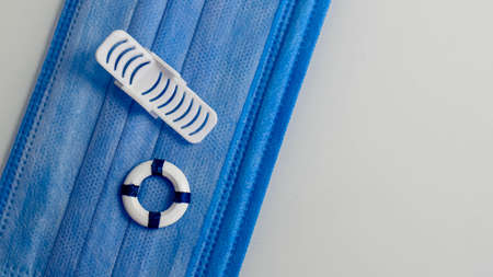Single medical mask against gray background during pandemie with copy space above. Vertical