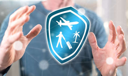 Concept of flight insurance with paper shield protected by hand of insurer; panoramic banner