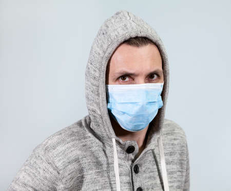 Scared Caucasian man in hood with one-use mask to protect him from virus.