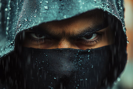 A figure stands in an urban setting, their piercing eyes visible beneath a dark hood and mask. Rain droplets cling to their attire, enhancing the intense atmosphere surrounding them.