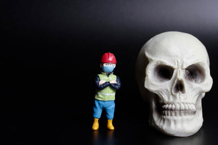 tired masked man on a dark background wipes sweat from his forehead, isolated