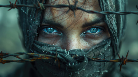A person in a hoodie stands defiantly behind a barbed wire fence, embodying resilience and protest.