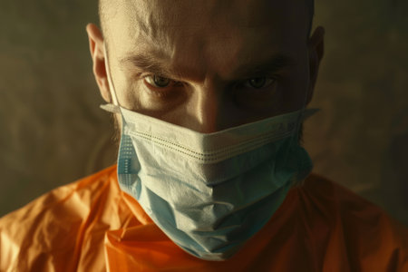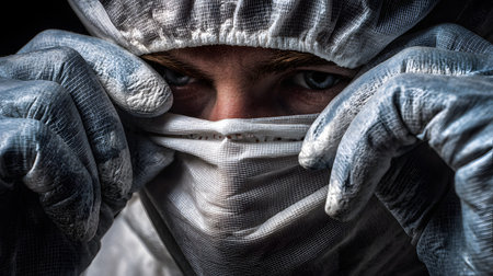 A protective glove donning protective suit face mask adjustment close up intense eyes