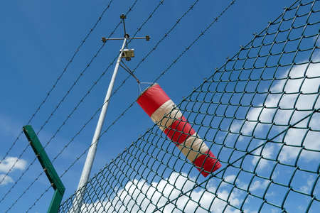 Wind direction indicator facilitates visual identification of direction and speed of wind at airports and heliports. Low angle view at the fence with barbed wire of airport Zurich in Switzerland.