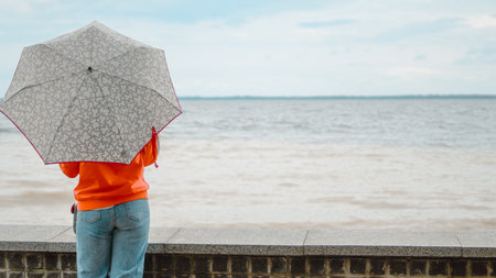 Girl by the sea with umbrella enjoying slow moment on windy cloudy day.