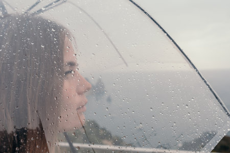 Woman rain umbrella. Happy woman portrait wearing a raincoat with transparent umbrella outdoors on rainy day in park near sea. Girl on the nature on rainy overcast day.
