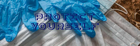 Medical latex gloves and protection masks on marble background, useful for pandemic prevention concept. Top view. Text PROTECT YOURSELF