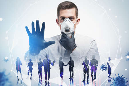 Young businessman in mask and gloves, his team and double exposure of network interface and coronavirus. Toned image