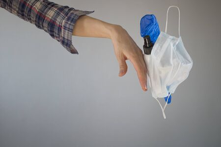 female hand throws out a mask, gloves and a disinfectant. Quarantine end and coronavirus is over. The virus and the disease are defeated. Covid -19 - off