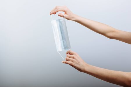 Woman hands holding face mask protective for spreading of disease virus,COVID-19 pandemic coronavirus