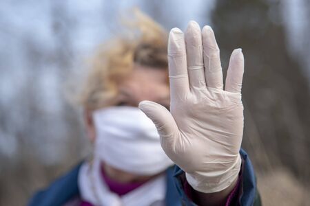 An elderly woman in a medical protective mask and rubber gloves gestures stop coronavirus. Concept photo symbolizing the end of the coronavirus epidemic. Focus on the gloved hand.