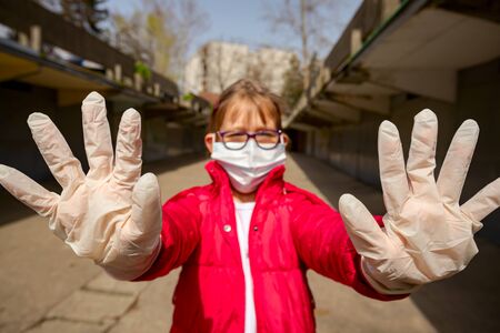 Little girl wearing medical mask and gloves is showing stop with her hands, gesture, social distancing, stay away, protected against virus COVID-19, Corona.