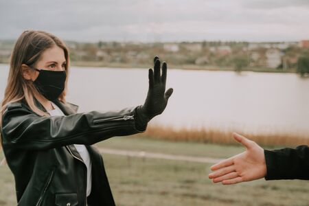 woman in black medical mask and latex gloves showing stop sign to a man. keep the distance and isolation concept