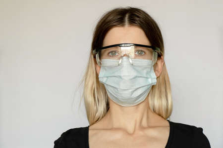 Portrait of woman wearing medical mask. Protection from catching disease. Pandemic of coronavirus concept.