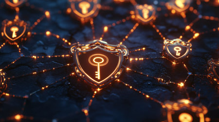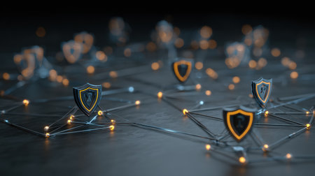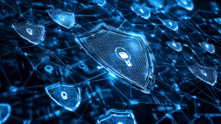 This image captures a digital security theme featuring glowing shields connected by a network, symbolizing protection and safety in the technology landscape.