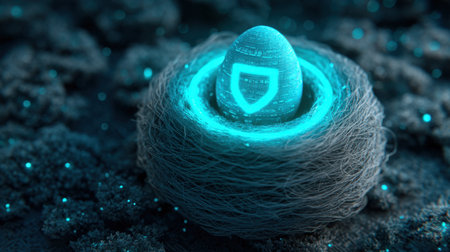 This captivating image depicts a futuristic digital egg nestled in a glowing nest, symbolizing security, innovation, and modern technology in a creative abstract environment.