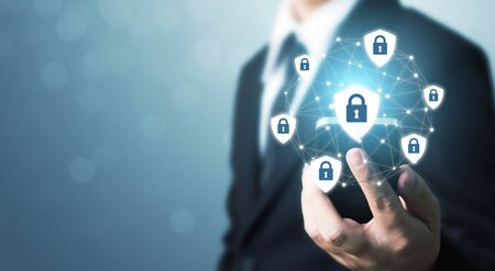 Cyber security secure and information technology security services concept. Businessman with protective gesture Lock secure icon to protect the security.