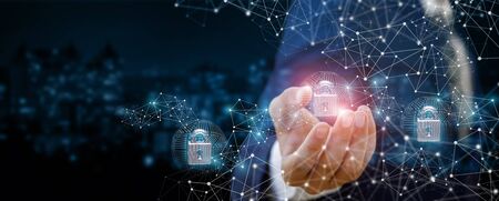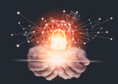 Cybersecurity data protection. Businessman holding padlock protect business financial and virtual cyber network connections. development of intelligent technology innovations from digital attacks.