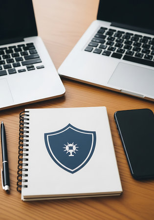 Two silver laptops are open on a wooden desk. In front of them is a white spiral-bound notebook with a blue shield logo containing a soccer ball. A black pen lies to the left of the notebook, and a black smartphone is to the right.