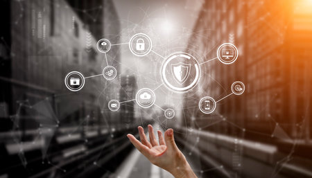 Cyber security technology and online data protection in innovative perception . Concept of technology for security of data storage used by global business network server to secure cyber information .