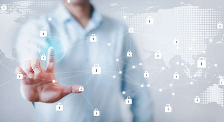 Cyber security network. Padlock icon and internet technology networking. Businessman protecting data personal information on tablet and virtual interface. Data protection privacy concept.