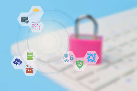 Blurred images of padlock and laptop keyboard with cyber security and data protection symbols