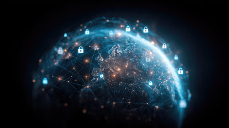 This image depicts an illuminated globe encircled by digital security locks and connected points, suggesting global data protection. The composition features a dark background, highlighting the glowing network of lights and nodes. This visual can represent concepts such as cybersecurity, data storage, and global technology, ideal for various commercial and editorial applications.