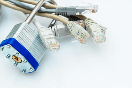 Network ethernet cables near opened padlock on computer motherboard. Internet data privacy information security concept. Blue toned image.