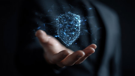 A captivating image featuring a hand emerging from darkness, presenting a holographic shield, symbolizing digital protection and security innovations.