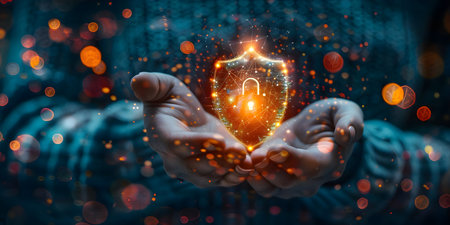 Hands holding glowing shield with a digital lock, symbolizing cybersecurity, data protection, and secure technology.