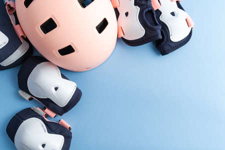 Top view of roller skates protective gear set - knee, elbow and wrist pads and helmet in pink colors. Blue background flat lay