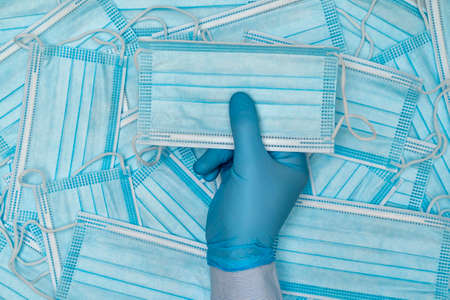 Doctor holding blue surgical medical face mask in two black protective glove in hands Concept on background of lot respiratory bandages for human face with rubber ear straps. Hygiene and health care