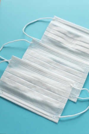 Medical masks on a colored background. Surgical blue mask. Medicine background