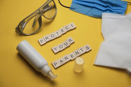 closeup of protective set of alcohol gel, mask , and rubber glove to disinfection of covid -19 and other bacteria
