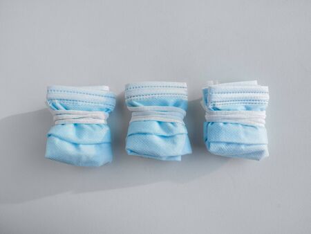 Used mask concept. Three folded used protective face mask isolated on white background. Protection before littering for prevent spread of virus.