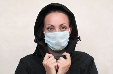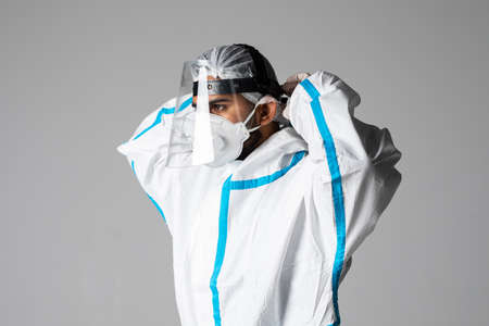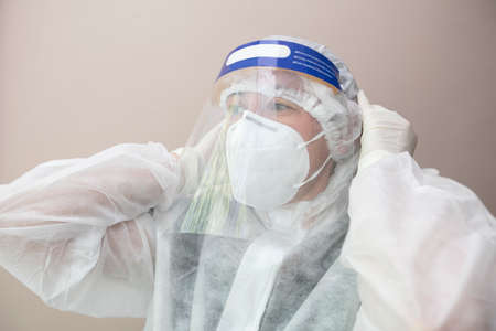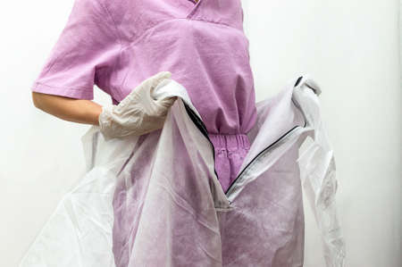 Young woman doctor puts on a Medical Protective Coverall over his clothes and prepares to work with sick patients. The process of putting on a medical protective Isolation Suit close-up