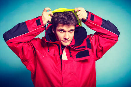 Young male getting dressed. Man putting on waterproof clothes. Adventure danger outdoors concept.