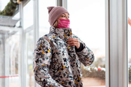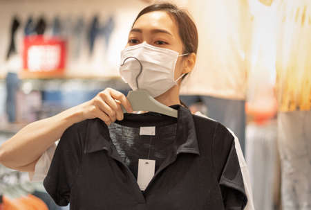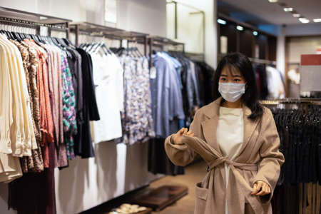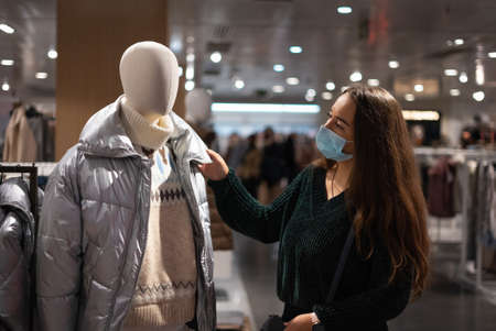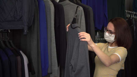 Woman wears beanie with protective mask choosing neutral cotton clothes on clothing rack in fashion store at shopping mall