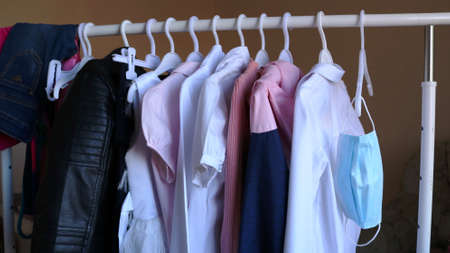 Neatly organized clothes on hangers after professional indoor dry-cleaning service