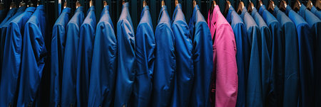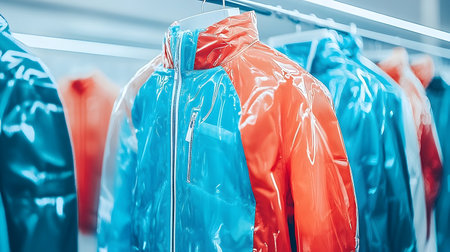 Colorful raincoats on hangers in wardrobe with neon lighting, pastel colors, background, AI generated