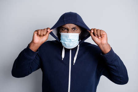The funny man in vest with hood is wearing sunglasses, protective wear in coronavirus pandemic.