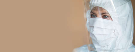 Women doctor wearing protective suit to fight coronavirus pandemic covid-2019. Protective googles, gloves, respirator.