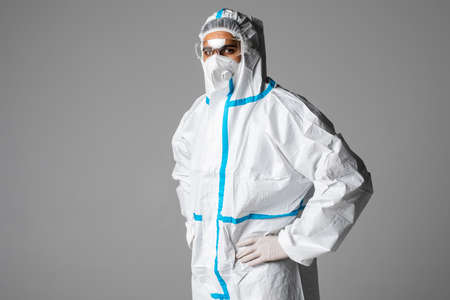 Portrait of man doctor wearing , protective glasses in protection suit, face surgical mask on white background.