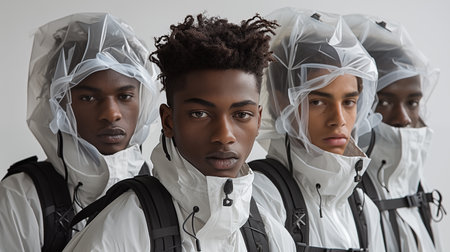 Male outdoorsman with covered face. Young man wearing waterproof oilskin. Adventure outdoor action danger concept.