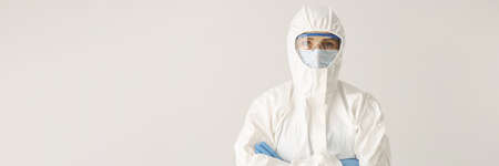 Woman doctor or scientist stands in protective suit, mask and glasses with folded arms on white background