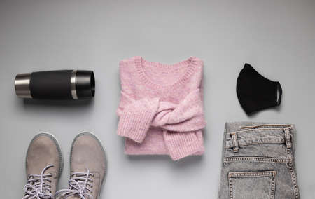 Female fashion look with black face protective mask.sweater, jeans, boots and thermos